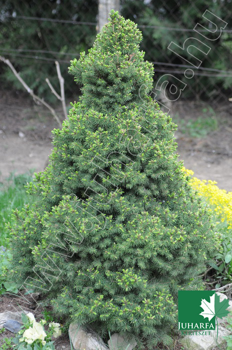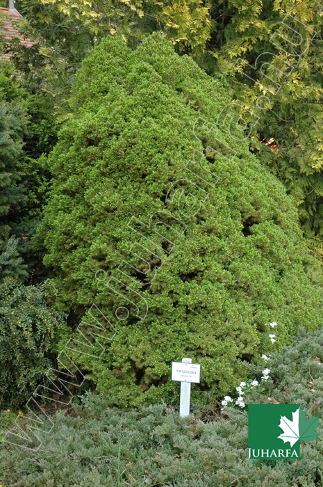 Kisméretű, lassú növekedésű, örökzöld fenyő. Szabályos zárt kúp habitusú, nagyon tömött, legfeljebb másfél méteres magasságú fenyő.