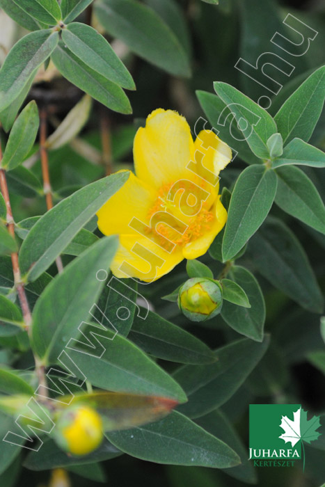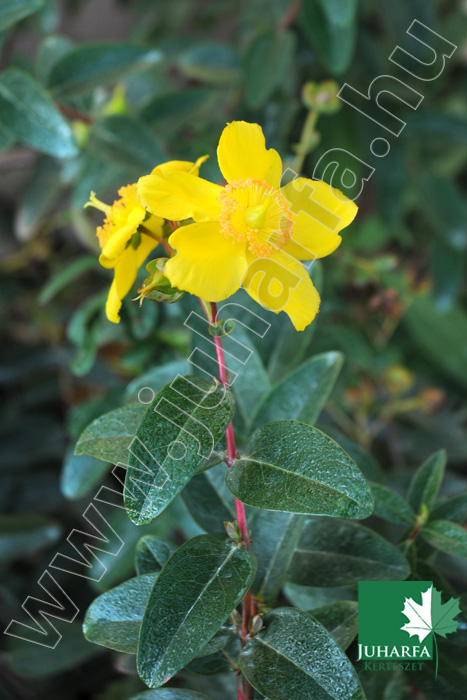 Egy-másdél méter magas, gömbölyded, télizöld cserje. Levele hosszúkásak, elliptikusak, mattak. Virágai nagyok 5 centiméter átmérőjűek, aranysárgák, a nyári második felétől sokáig nyílnak a hajtások csúcsán.