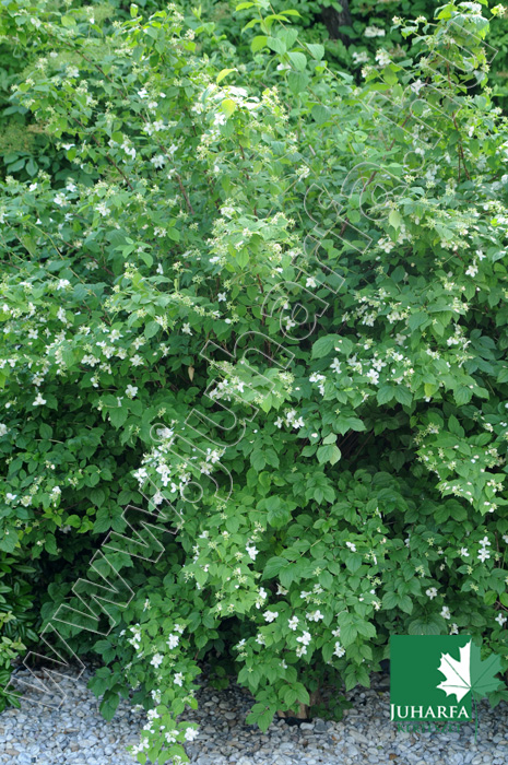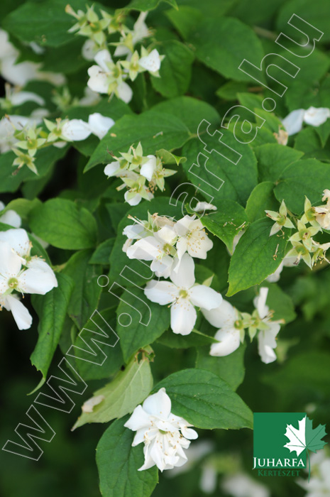 Akár 2-3 méteres magasságot is elérő lombhullató cserje. Vesszei határozottan felfelé törnek, levelei tojásdadok, kihegyezettek. Virágai fehérek, 2-3 centiméter átmérőjűek, nagyobb csoportokban nyílnak, nagyon kellemesen erős illatúak.