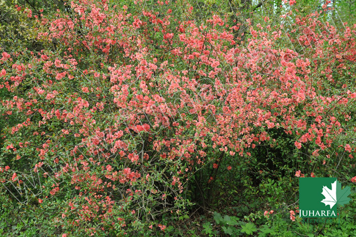 Nagyobb termetű, másfél méter magas, sűrű, lombhullató cserje. Levelei kerekdedek, sötétzöldek, virágai rózsaszínűek. Nagy, alma alakú, citromsárga termései illatosak, de ízük nagyon fanyar.