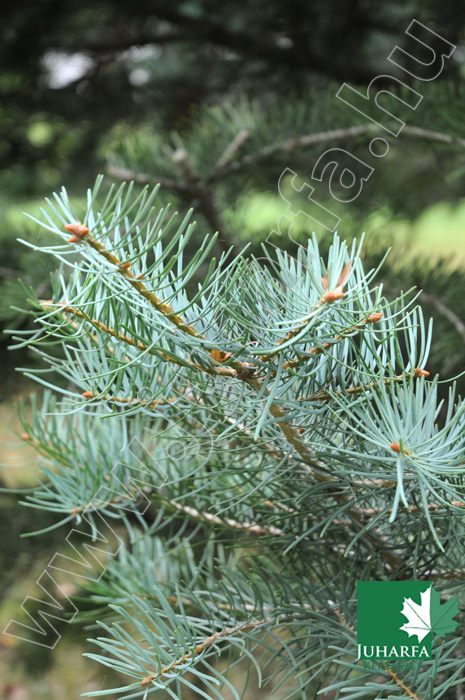 Levelei rövidek, vastagok, zöldesek a fonákuk ezüstös. Már fiatal korban is hoz tobozokat, amelyek lilásak, éretten barnák.