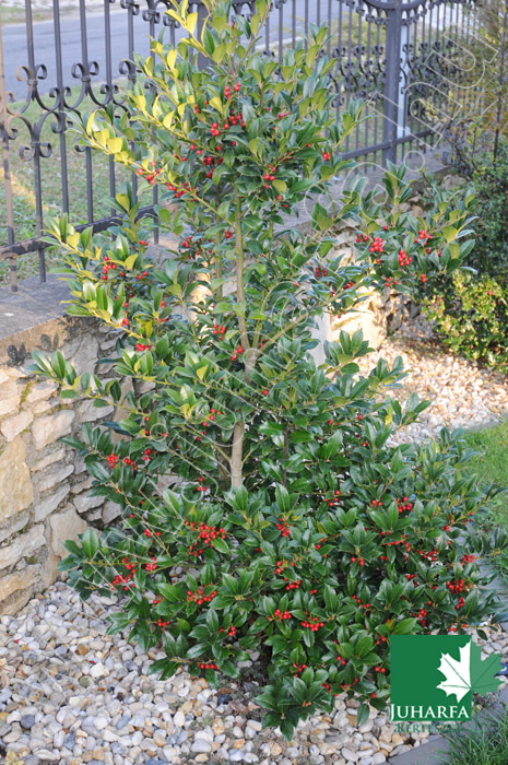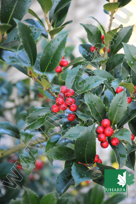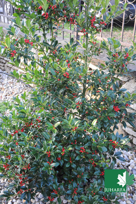 Tömött, sokszor tőből elágazó, közepes méretű, 2-3 méteres magasságú örökzöld. Vesszei merevek, enyhe kúp alakú koronát formáznak. Levelei vastagok, fényesek, bőrszerűek, elliptikusak, a levélszéleken szúrós fogakkal. Virágai aprók, fehérek, nyár elején nyílnak, egyivarúak. Termései piros színű bogyók, amelyek szeptembertől egész télen át díszítenek.
