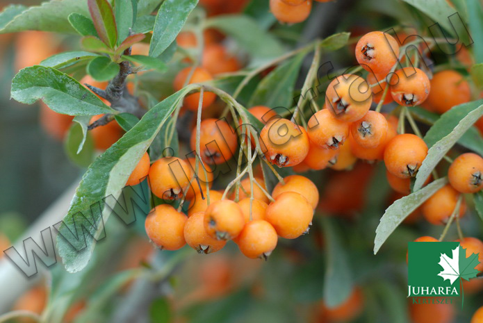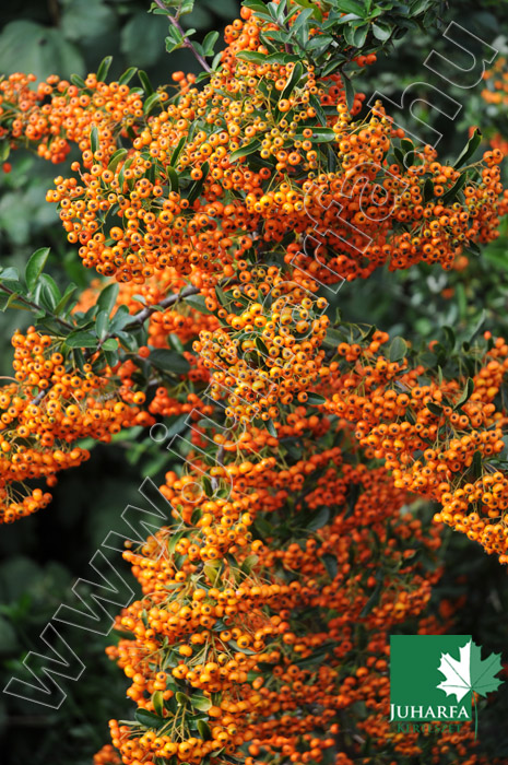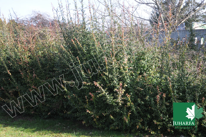 Örökzöld, 2-3 méteres magasságú, tömött bokrot alkotó, felfelé törő, erősen szúrós cserje. Levelei keskenyek, hosszúkásak, elliptikusak, fényesek. Virágai fehérek, aprók, de nagyméretű virágzatokba tömörülnek, május-júniusban. Termései csoportokban képződnek, narancspirosak, beborítják a növényt, sokáig a növényen maradnak, a madarak fogyasztják el.