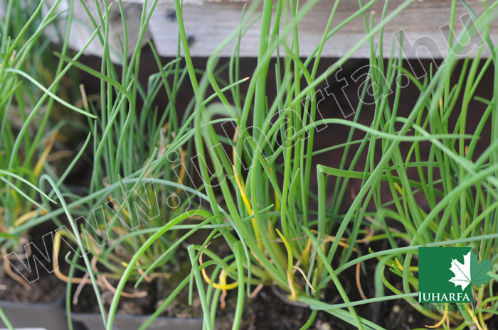 Alacsony, sok szálat hozó évelő. Haragos zöld levelei kellemes hagyma illatúak, vágás után is újra hajtanak. Virágai kékes színűek.