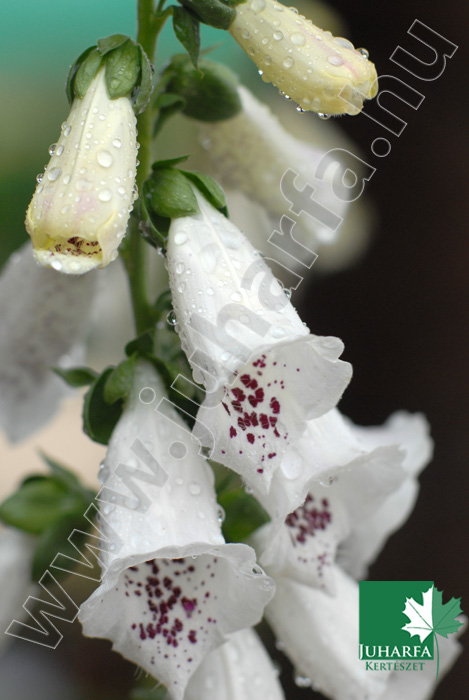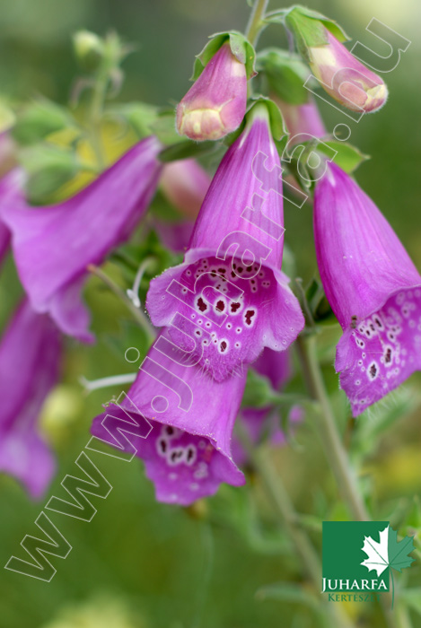 Virágai felálló virágzati szárakon jelennek meg, nagyméretűek, gyűsz alakúak, foltosak. Virágszíne bíbor, rózsaszín, fehér színekben változnak, június-júliusban nyílnak.