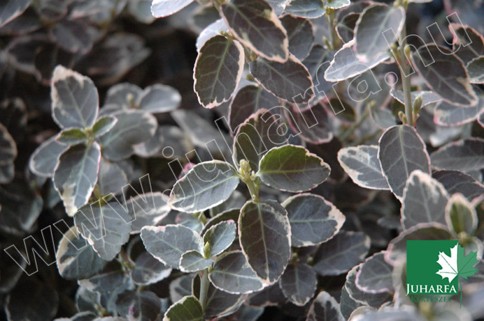 50 centiméteres magasságú, örökzöld cserje, azonban kapaszkodva több méter magasra is feljut. Levelei szélesek-elliptikusak, széleinek ezüstös fehér csíkkal, amely télen rózsaszínesre változik.