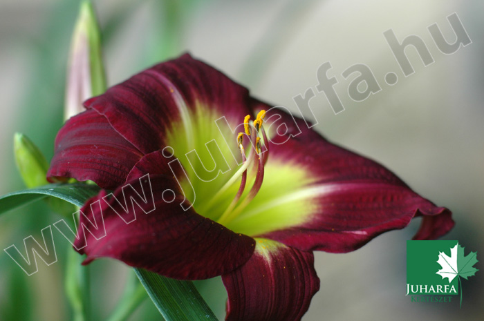 Virágai nagyok, sötétbordóslilák, sárgászöld középpel, kerekdedek, majdnem egész nyáron nyílnak.