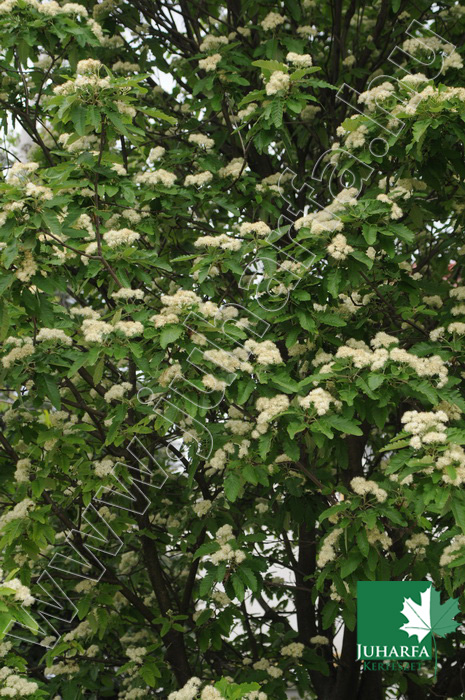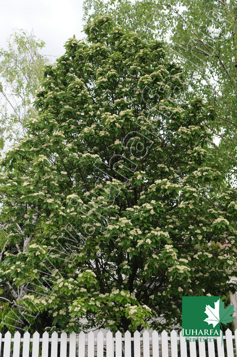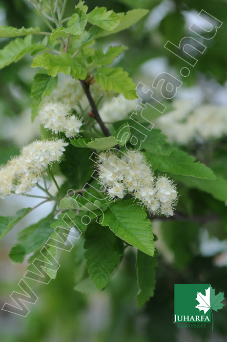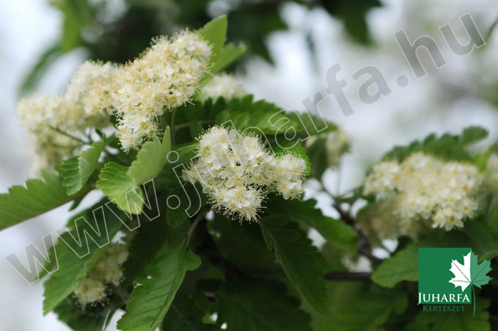 Közepes, legfeljebb 10-12 méteres magasságú fa, vagy nagyobb, lombhullató cserje. Koronája kúpos, később tojásdaddá válik. Levelei 8-10 centiméteresek, tojásdadok, változatosan fogazottak. Virágai júniusban nyílnak, fehérek, termései narancsvörösek, 1 centiméteresek, gömbölydedek.