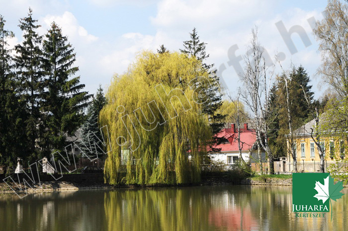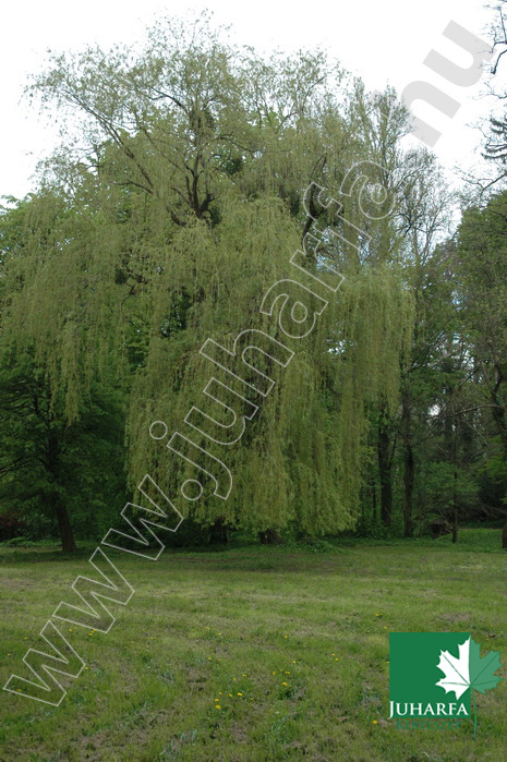 Nagy méretű, jellegzetes habitusú lombhullató díszfa. Akár 15 méteres magasságot is elérő, csüngő ágrendszerű fa. Vesszei sárgák, hajlékonyak, függőlegesen lefelé csüngenek.. Levelei keskenyek, hosszúak, hegyesek, ezüstös színűek. Virágai nem feltűnőek.