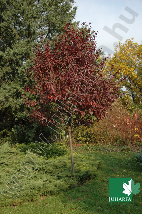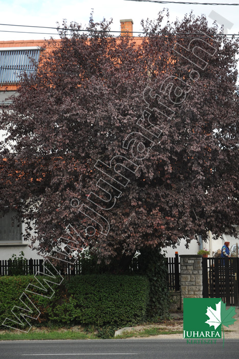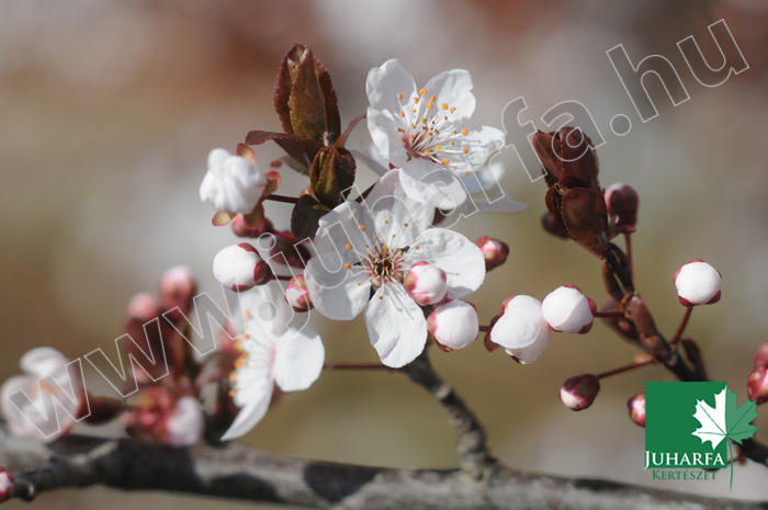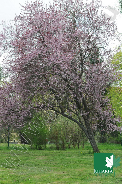 Kisméretű, legfeljebb 5 méteres magasságot elérő fa, vagy cserje. Koronája kezdetben felfelé tör, később egyre inkább gömbre hasonlít. Levelei tojásdadok, kihajtáskor barnásvörösek, később feketésbordók. Virágai lombfakadás előtt nyílnak, rózsaszínek, illatosak. Termései 4-5 centiméter átmérőjű, bordó, nem magvaváló, gömb alakú, édes szilva. Nagyon dekoratív, jó tulajdonságú díszfa.
